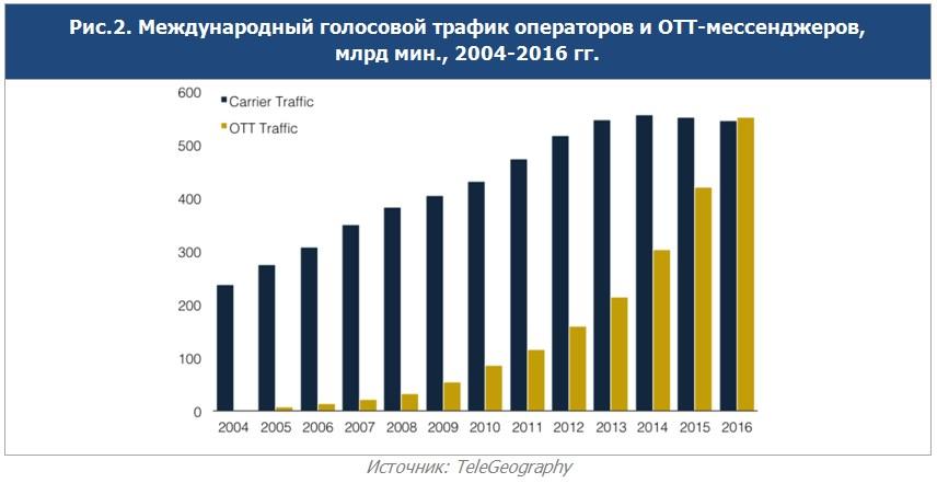 Как отмечается в исследовании, в 2016 году международный голосовой OTT-трафик впервые превысил традиционный телефонный трафик – 552 млрд мин. против 546 млрд мин, соответственно.