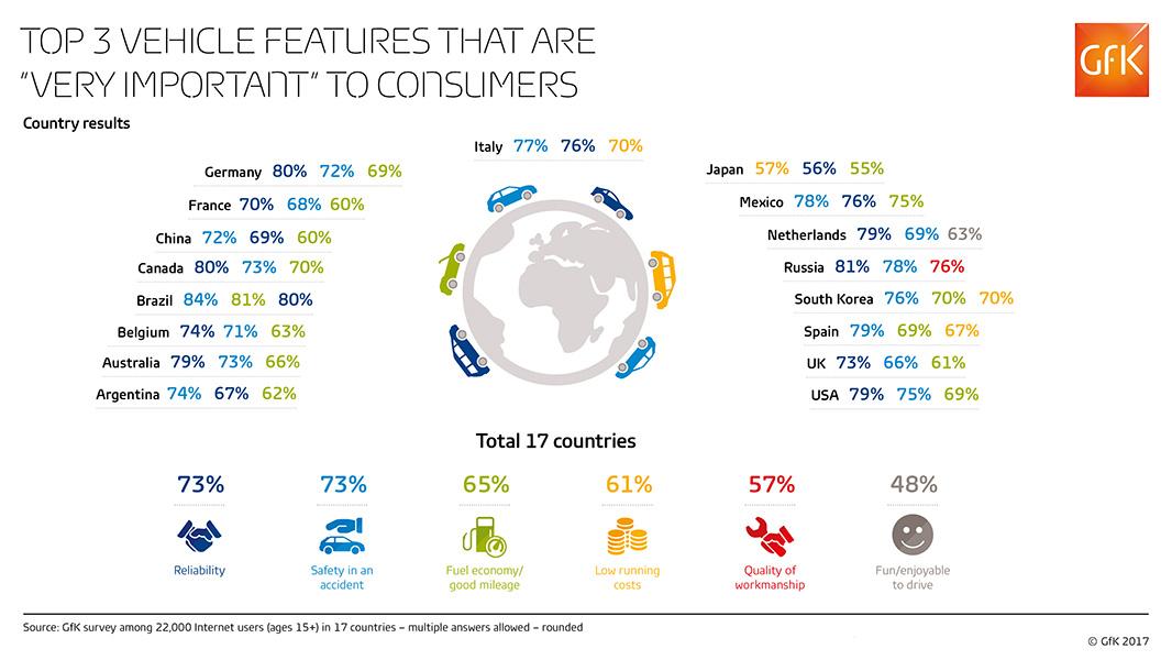 Что касается российских автолюбителей, то, по словам руководителя отдела исследований автомобильного рынка GfK Rus Александра Кисова, они больше всего ценят такие характеристики как надежность, высокая безопасность при возникновении ДТП и качество производства. «И если по первым двум аспектам мы мало чем отличаемся от остального мира, то «качество сборки» – это наш чисто российский «пунктик». 76% респондентов выдвигают особые требования к качеству производства автомобиля», - отметил г-н Кисов.