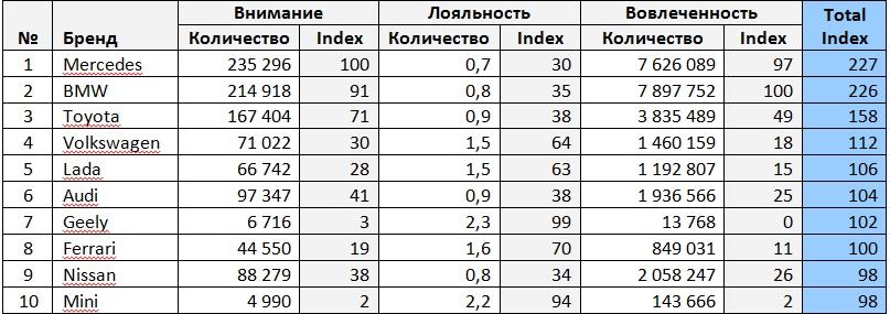 Первое место занял Mercedes, который по сравнению с январским рейтингом опередил BMW. В отчете утверждается, что на это повлиял рост активности популярных Instagram и Youtube-блогеров, желающих ассоциировать себя с немецкой маркой, а также обсуждение информационных поводов, среди которых перспектива строительства завода Mercedes в непосредственной близости от Москвы.