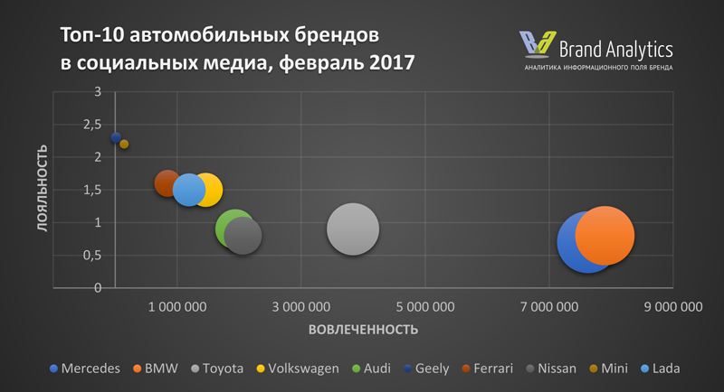Топ-10 автомобильных брендов в социальных медиа по индексам внимания, лояльности и вовлеченности на пузырьковой диаграмме, где вовлеченность и лояльность расположены по осям, а объем внимания – размер пузырька