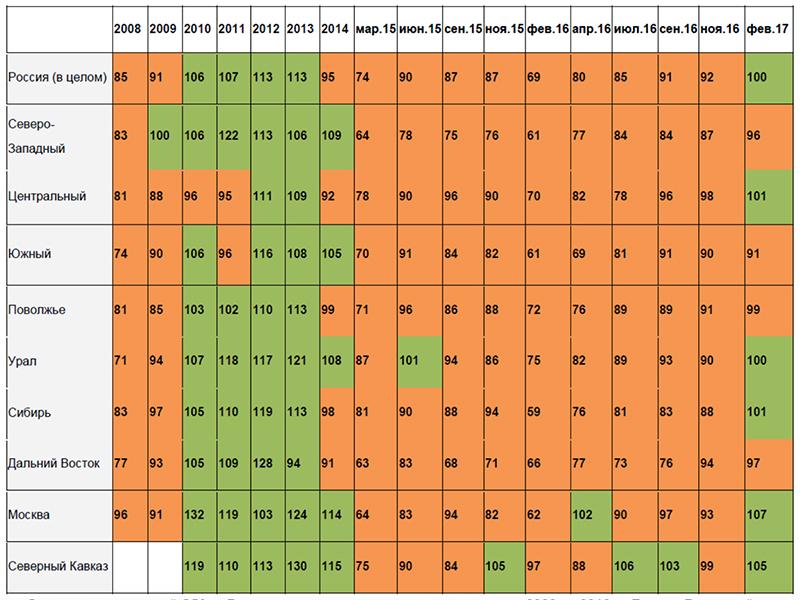 При этом в пяти из девяти Федеральных округов России настроения потребителей – уже в позитивной зоне (Индекс выше 100 пунктов). В числе регионов, где в 1 квартале 2017 года потребители настроены оптимистично - Центральный ФО, Сибирь, Северный Кавказ и Москва. В Уральском регионе настроения, как и в целом по России, – в нейтральной зоне и близки к позитивным (100). В негативной зоне - хотя уже и с улучшившимися показателями Индекса - пока остаются Южный ФО, Поволжье и Дальний Восток.