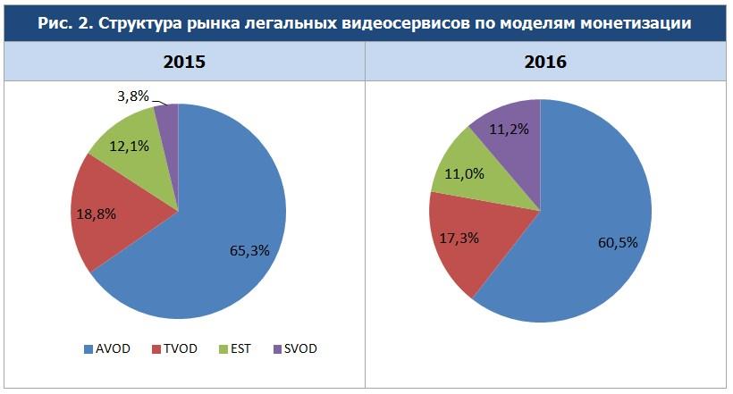 В 2016 году в структуре рынка произошли существенные изменения, отмечается в исследовании. Как и прежде, наиболее распространенной моделью монетизации является рекламная (AVOD). Но игроки все более успешно зарабатывают на платном контенте, прилагая к этому много усилий (развитие платформ доставки, реклама, улучшение сервиса и удобства оплаты). В результате в 2016 году доля AVOD на рынке значительно снизилась и составила 60,5%. От этого выиграла подписка, доля которой увеличилась с 3,8 % до 11,2 %. Теперь она занимает третье место в структуре рынка и опережает сегмент EST (приобретение пользователями цифровой копии контента).
