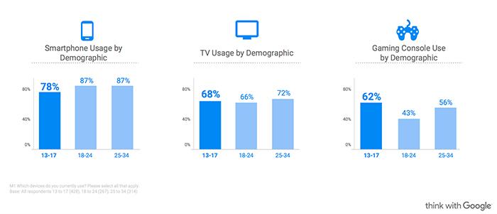 Изучались и отличия от поведения старших поколений, для чего было проведено онлайн-анкетирование с помощью панели Ipsos не только подростков от 13 до 17 лет, но и молодых взрослых (18-24 года) и взрослых от 25 до 34 лет. Всего в августе 2016 года было опрошено более двух тысяч человек, проживающих на территории США.