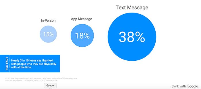 Подростки предпочитают общаться с помощью текста, используя более чем в два раза больше приложений для обмена сообщениями, чем приложений face-to-face. Забавный факт: Почти 3 из 10 подростков говорят, что они обмениваются текстовыми сообщениями с людьми, которые в это время находятся рядом