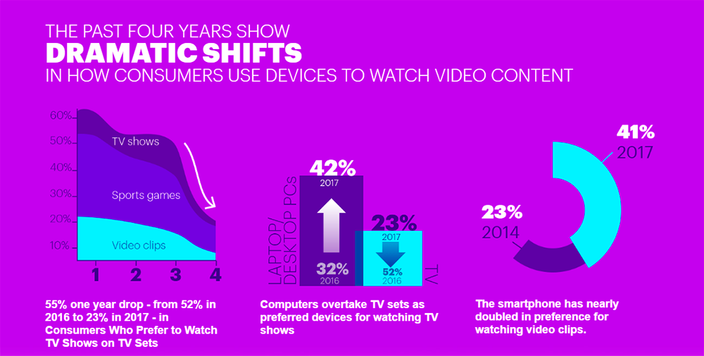 Компания Accenture провела очередной опрос интернет-пользователей, чтобы выяснить, на каких устройствах они предпочитают смотреть телешоу. Только 23% опрошенных заявили, что смотрят ТВ традиционным способом – по телевизору. Еще год назад этот показатель был равен 52%.