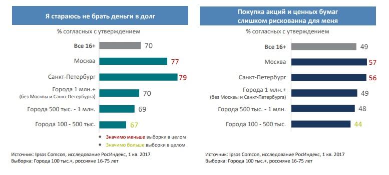 70% респондентов стараются не брать деньги в долг. Жители небольших городов более склонны к рискованному финансовому поведению. В частности, риском считают покупку акций и ценных бумаг. В целом по России для себя считают это рискованным 49% респондентов.