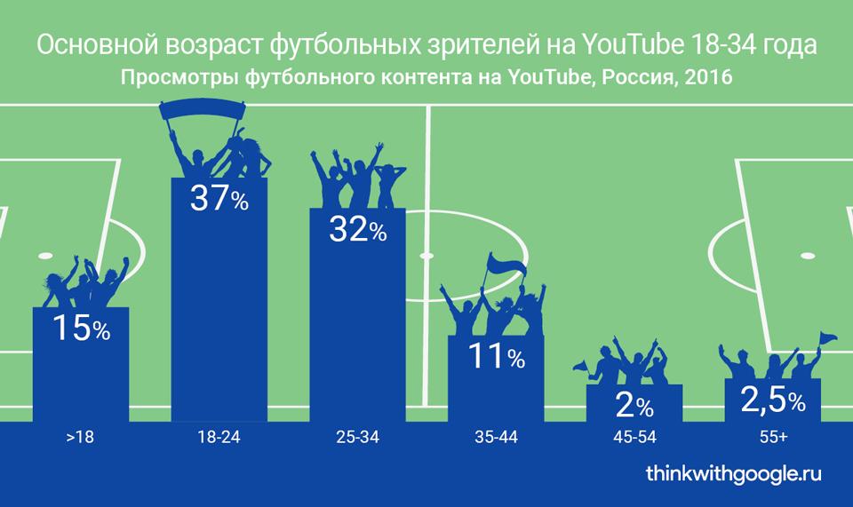 Ежемесячно 20,4 млн любителей спорта заходят на YouTube. Несмотря на расхожее мнение, что видео на этой платформе смотрят в основном подростки, большая часть зрителей футбольного контента на YouTube относится к возрастной группе от 18 до 34 лет. Эта молодая и активная аудитория ищет новые форматы взаимодействия с любимым видом спорта, выходящие за границы традиционного просмотра матчей перед экраном ТВ. Они хотят получать больше мнений, делиться эмоциями прямо во время игры и смотреть футбол в удобное время. Они не всегда придерживаются официального расписания турниров, а смотрят футбольные видео и матчи в течение дня — с 13 до 22.
