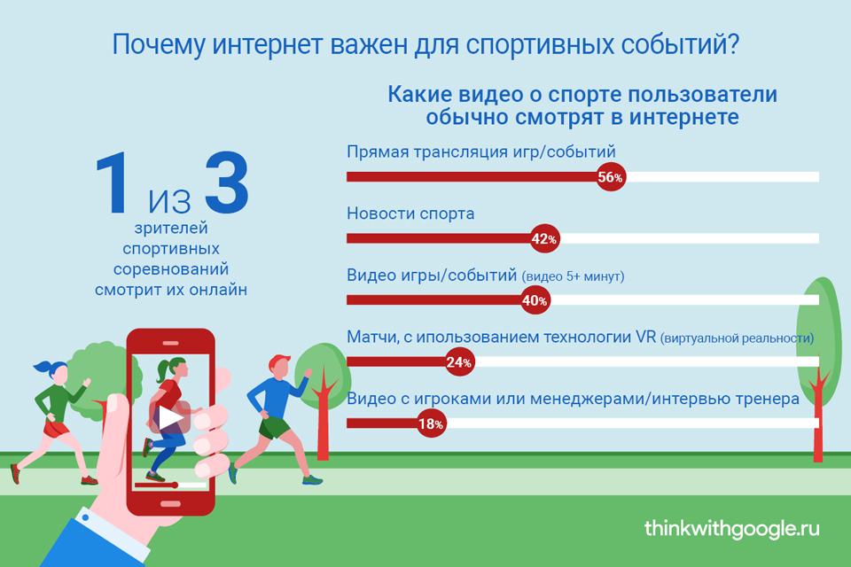 Технологии меняют привычки болельщиков. Фанаты все чаще выбирают онлайн-платформы, чтобы смотреть любимый контент в удобном формате Сегодня каждый третий пользователь следит за спортивными мероприятиями онлайн, говорится в исследовании Google. 56% предпочитают смотреть в интернете трансляции игр и мероприятий, 42% — спортивные новости, а 40% — пересматривать значимые моменты матчей.