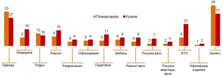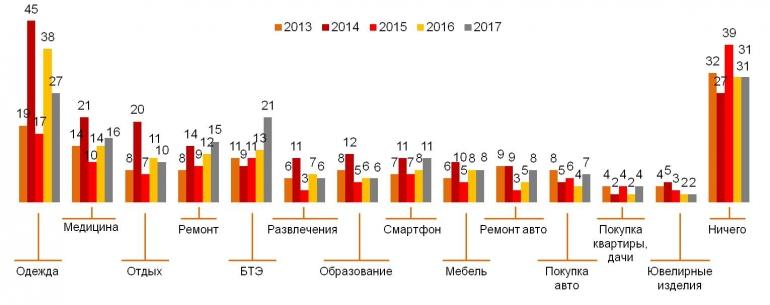 Согласно исследованию холдинга «Ромир», по сравнению с прошлым годом существенно сократилась доля россиян, которые приобрели одежду и обувь (38% в 2016 году, 27% в 2017-м). Самый большой рост был выявлен в покупках бытовой техники и электроники (21%), смартфонов и планшетов (11%), в приобретении автомобилей (7%) и их ремонте (8%), в покупке квартир, домов и дач (4%).