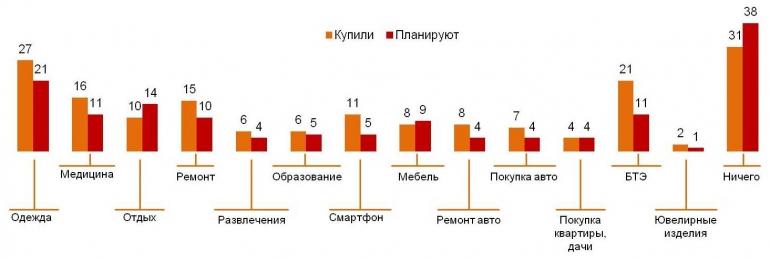 К тому же, как отмечают авторы исследования, заявленные год назад планы на крупные траты разошлись с реальностью в сторону увеличения расходов. «Сэкономить россиянам удалось только на покупке одежды и обуви – планировали покупки 33%, а реально купили 27%. Крупные расходы на отдых планировали 12% россиян, а в итоге их осуществили 10%. Почти совпали планы и реальность в вопросе оплаты образования (5% и 6%), трат на развлечения (4% и 6%), покупку мебели (6% и 8%) и ювелирных изделий (1% и 2%). По остальным же статьям планы были превышены, причем в некоторых случаях в двойном и более размере», - говорится в отчете.