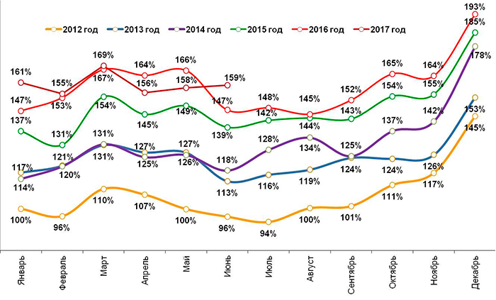 Вопреки традиционному июньскому тренду снижения повседневных расходов россиян продолжился их рост, начавшийся в первом месяце 2017 г.