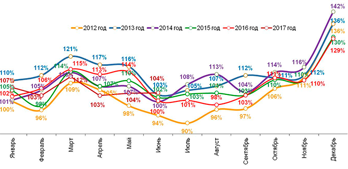 График 1. Динамика номинальных повседневных расходов жителей российских городов с населением от 100 тысяч жителей. Январь 2012 – июнь 2017.