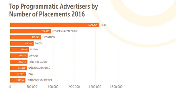 Лидируют по количеству размещений в programmatic следующие компании: Ford, Reckitt Benckiser Group, Exponation, Toyota, Verizon, Comcast, Procter & Gamble, National Amusements и NSGV.