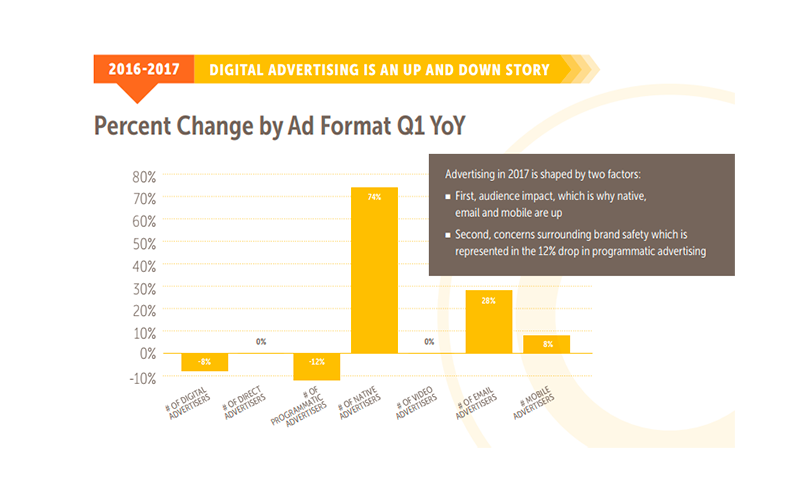 Компания MediaRadar, занимающаяся разработкой рекламного программного обеспечения, проанализировала расходы 266 324 рекламодателей, а также форматы и тип закупок, которые выбирали маркетологи в первом квартале 2017 г.