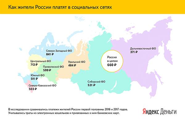 В соцсетях люди оплачивают игры, подарки, смайлики, стикеры и оценки, которые можно ставить другим пользователям. Также россияне платят за премиум-аккаунты, попадание в топ рейтингов, режим «Невидимка» и возможность посмотреть посетителей своей страницы. За полгода в целом по стране каждый пользователь совершает в среднем 3,8 платежа.