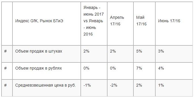 По итогам первого полугодия 2017 г. продажи в штуках на рынке бытовой техники и электроники в России выросли на 2%, следует из исследования GfK. При этом оборот рынка в рублях остался практически на уровне прошлого года. Как сообщается, его стабильность поддерживает позитивная динамика продаж в денежном выражении в сегментах крупной бытовой техники и смартфонов. В небольшой плюс вышел и оборот рынка компьютерной техники.