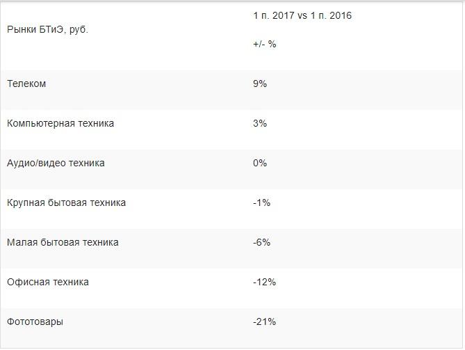 Таб.2. Динамика продаж в сегментах рынка бытовой техники и электроники в России в 1 полугодии 2017 г. в сравнении с 1 полугодием 2016 г.