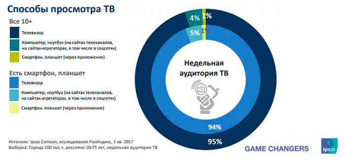 Как следует из исследования Ipsos Comcon, 95% недельной ТВ-аудитории смотрит телевизионный контент по телевизору, 4% – на компьютере или ноутбуке и лишь 1% – на смартфоне или планшете. Результаты отчета компании приводит «Коммерсантъ». Примечательно, что значительно более высокий процент зрителей ТВ на планшетах среди их владельцев старше 50 лет – в этой группе их 4%.