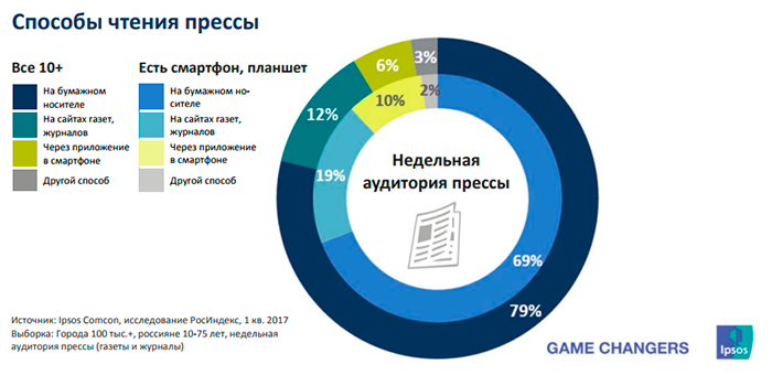 Напротив, аудитория прессы охотнее воспринимает этот контент на цифровых носителях. 10% жителей города читают газеты и журналы на их сайтах, еще 6% пользуются для этого смартфонами. Бумажный вариант изданий читают 70% опрошенных. Наиболее активно прессу с мобильных устройств читают люди в возрасте от 10 до 20 лет – таковых оказалось 23% опрошенных в этой группе, среди опрошенных 21–40 лет таких 10%.
