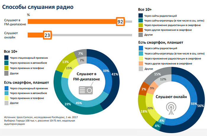 Что касается радиослушателей, 92% респондентов выбирают FM-радио, включая стационарный приемник (41%), приемник в автомобиле (39%) или в телефоне (13%).
