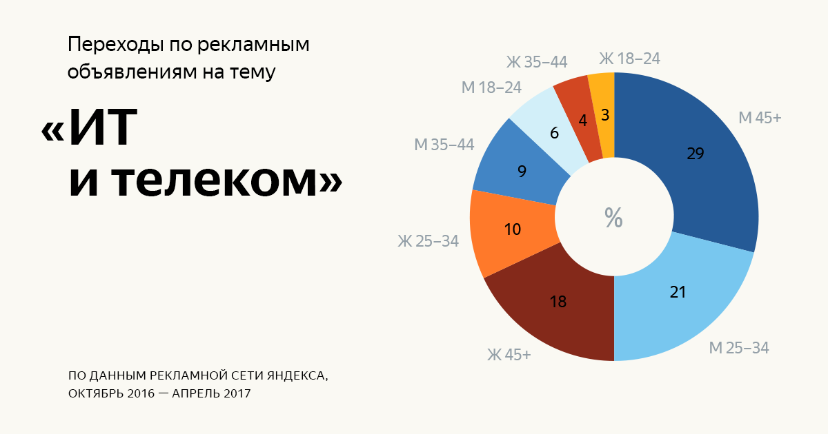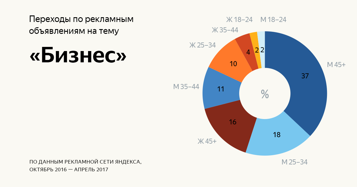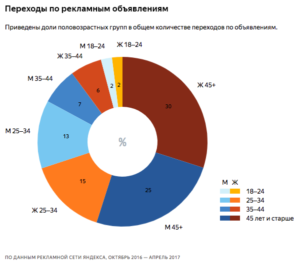 Пользователи старшего возраста чаще остальных кликают на объявления во всех тематических областях, от темы автомобилей до юридических услуг. «В большинстве областей наиболее активны женщины 45 лет и старше. Их доля хорошо заметна даже в тематиках, которые в среднем больше интересуют мужчин. Например, на женщин старшего возраста приходится 16% всех кликов на объявления в области «Бизнес», - отмечается в исследовании. Переходы по рекламным объявлениям в разных тематических областях подробнее можно посмотреть здесь.