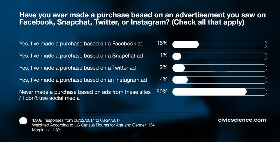 К такому выводу пришли специалисты американской исследовательской компании CivicScience, занимающейся изучением потребительских инсайтов. Как сообщается в отчете исследования, в ходе которого было опрошено более 1900 потребителей США, 16% из них совершили покупку благодаря рекламе Facebook, в то время как после просмотра рекламы в Snapchat приобрели товар только 1% респондентов.