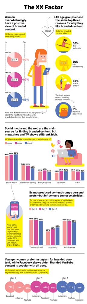 Согласно полученным результатам, положительно воспринимают брендированный контент 83% поколения X, 87% возрастной группы Y и 89% Z, самого молодого поколения участниц исследования.