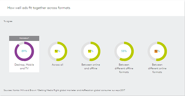 Большинство опрошенных маркетологов (89%) считают, что различные составляющие их рекламных кампаний формируют гармоничное целое, но с этим согласны, в среднем по миру, лишь 58% потребителей (в России 52%).