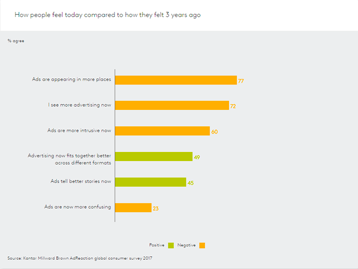 «Потребители чувствуют, что их жизненное пространство слишком забито рекламой, в то время как маркетологи, стремясь установить с потребителями контакт, используют всё больше и больше каналов взаимодействия», - комментирует ситуацию Дункан Саутгейт, глобальный бренд-директор Kantar Millward Brown по исследованиям в сфере Media&Digital.