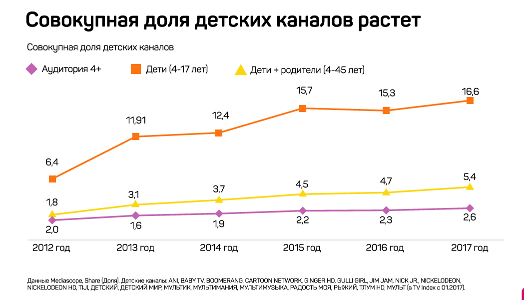 «Детская аудитория позитивно реагирует на новые предложения и является одним из главных драйверов телеиндустрии, — считает эксперт. Теперь в России впервые появилось поколение (5-12 лет), для которых ТВ что-то сделало специально — каналы типа «Карусели». Дети растут, и в ближайшие 5-10 лет перейдут в другие возрастные группы, для которых ТВ делает предельно мало контента. Сможет ли индустрия предложить им что-то такое же качественное, как для детей – главный вызов для ТВ».