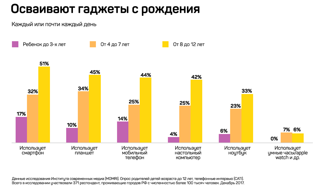 Для современного ребенка характерно ранее овладение цифровыми устройствами и высокая вариативность медийного поведения, говорится в исследовании. В опросе приняли участие около 300 родителей детей от 3 до 10 лет, проживающие в городах-миллионниках.