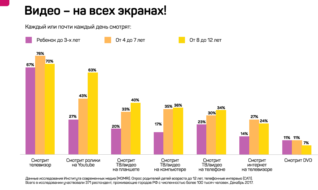 По словам Кирилла Танаева, директора Института современных медиа (MOMRI), несмотря на увлечение гаджетами, дети продолжают много смотреть ТВ — более 2 часов в день. В 2017 году общее время смотрения телепередач снизилось везде, кроме детской группы и 50+.