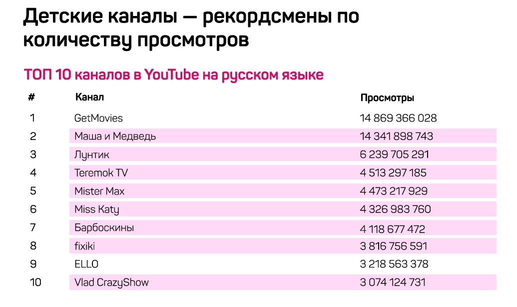 Авторы исследования также назвали топ-10 детских каналов на YouTube на русском языке. 1. GetMovies – 14 869 366 028 просмотров 2. Маша и Медведь — 14 341 898 743 3. Лунтик — 6 239 705 291 4. Teremok TV — 4 513 297 185 5. Mister Max — 4 473 217 929 6. Miss Katy — 4 326 983 760 7. Барбоскины — 4 118 677 472 8. Fixiki — 3 816 756 591 9. ELLO — 3 218 563 378 10. Vlad CrazyShow — 3 074 124 731