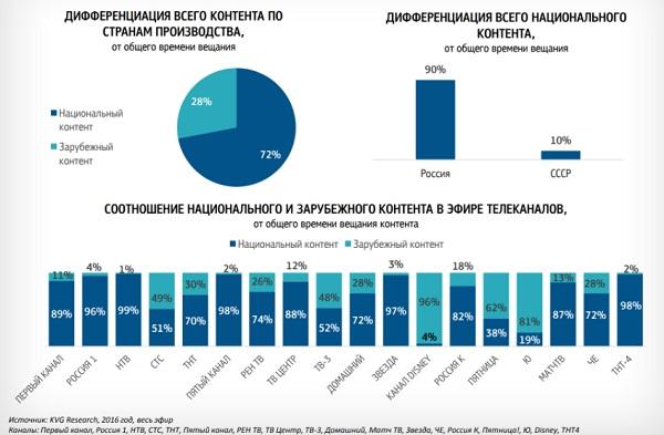 Национальный контент от общего времени вещания составил 72%, зарубежный – 28%. При этом лидером по показу зарубежного контента стал канал Disney – 98% от общего времени вещания, а лидером по показу национального контента канал НТВ – 99%.