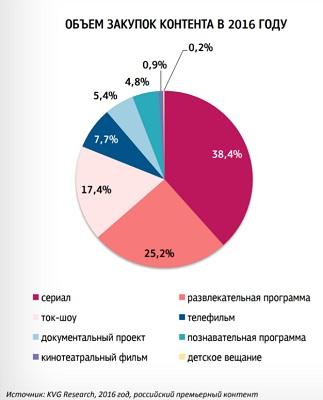 Общая рыночная стоимость транслируемых премьер на российских каналах составила 49 млрд руб. в 2016 г. При этом 29,1 млрд руб. приходилось на три крупнейших канала (Первый канал, Россия 1, НТВ). Лидирующую позицию по объемам закупок контента заняли сериалы – 38,4%.