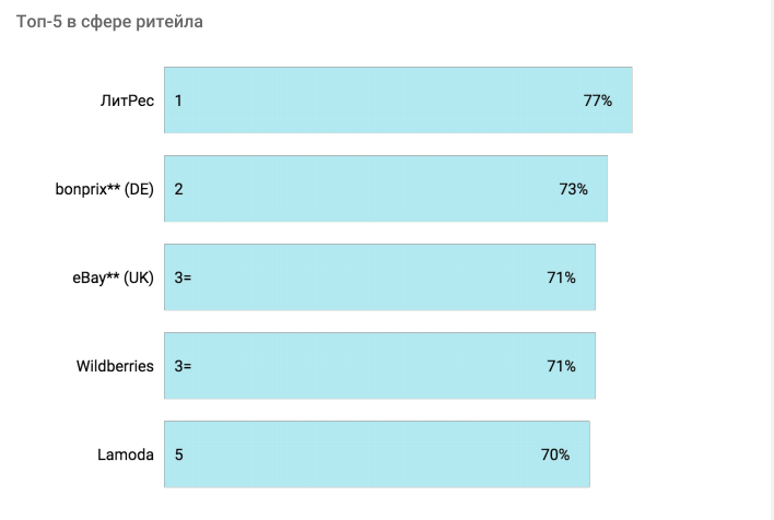 Лидерами среди мобильных сайтов в сфере ритейла в России стали «ЛитРес» (77%), bonprix (73%), eBay и Wildberries, разделившие третье место (71%), и Lamoda (70%). При этом лучшим по возможности поиска стал сайт Vseinstrumenti — 93%. «ЛитРес» стал лучшим в двух номинациях одновременно: по удобству использования страницы продуктов (92%), а также регистрации и конверсии (95%). В мобильном дизайне фаворитами стали DNS-shop и Ikea — 100%.