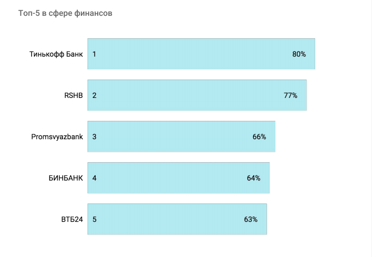 В топ-5 в сфере финансов вошли «Тинькофф Банк» (80%), RSHB (77%), «Промсвязьбанк» (66%), «БИНБАНК» (64%) и ВТБ24 (63%). Лучшими по удобству поиска, а также регистрации и конверсии стал «Тинькофф» (80% и 91% соответственно), RSB по юзабилити страны продуктов (100%). В мобильном дизайне фаворитами стали «БИНБАНК» и «Тинькофф».