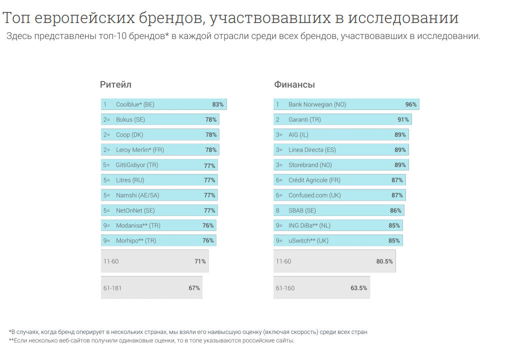 В топ-3 европейских брендов, принимавших участие в исследовании, в сфере ритейла вошли Coolblue, Bokus, Coop, а в сфере финансовых услуг — Bank Norwegian, Garanti, AIG.