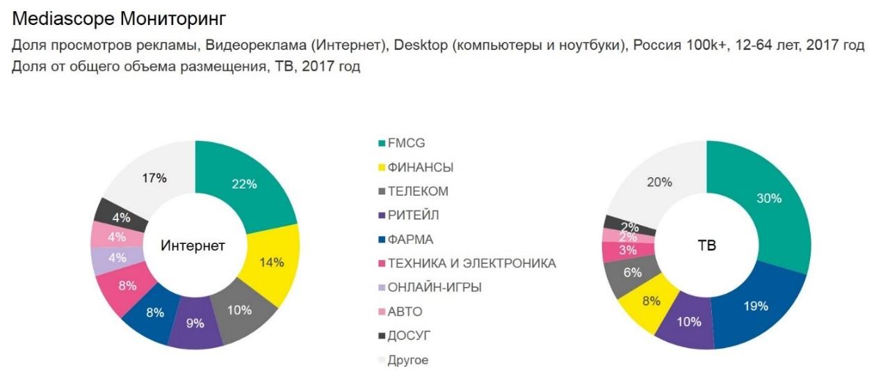 FMCG стала лидирующей категорией по количеству просмотров как в интернете, так и на телевидении. Четверть просмотров видеорекламы в 2017 г. пришлась на категории «финансы» и «телеком», тогда как на ТВ эти категории составляют лишь 14% от общего объема размещений. Реклама техники и электроники в структуре просмотров заметнее в интернете, чем на ТВ (8% против 3% на ТВ), как и реклама онлайн-игр (4% против 0,2%).