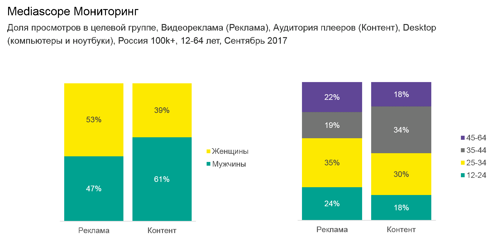 Так, мужчины составляют 61% от зрителей, но только 47% видеорекламы приходится на них. Соответственно женская аудитория, наоборот, в дефиците: 39% просмотров видеоконтента против 53% просмотров видеорекламы. Среди возрастных групп пользователи 35-44 лет остаются недооцененными у рекламодателей, треть просмотров контента приходится именно на них, хотя в структуре рекламных просмотров они составляют лишь 19%.