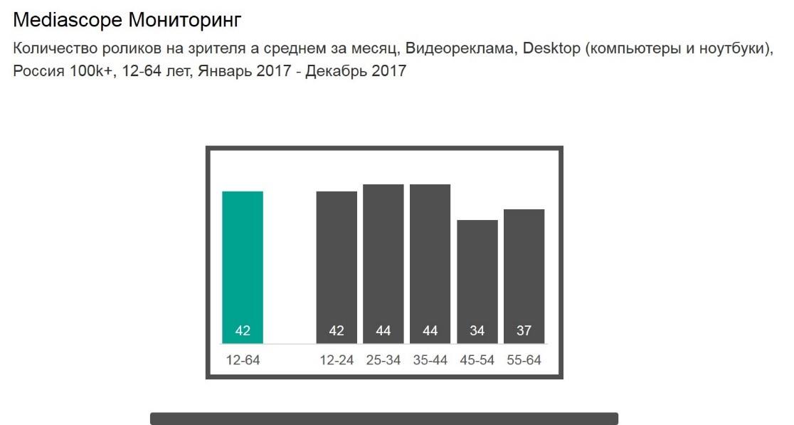 В среднем за месяц пользователь интернета просматривал более 40 рекламных видеороликов, при этом в декабре на одного пользователя приходилось почти 80 просмотров. Для аудитории 45-64 лет характерна относительно низкая частота просмотров рекламы, однако спрос и предложение в этой целевой группе практически сбалансированы.