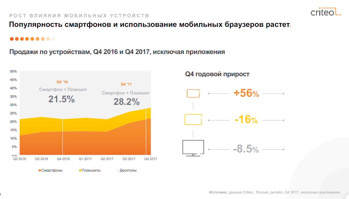 В России количество покупок через мобильные браузеры на смартфонах выросло на 56% с октября по декабрь 2017 г., следует из глобального исследования коммерции от компании Criteo. Продажи через десктоп и планшеты продолжают падать