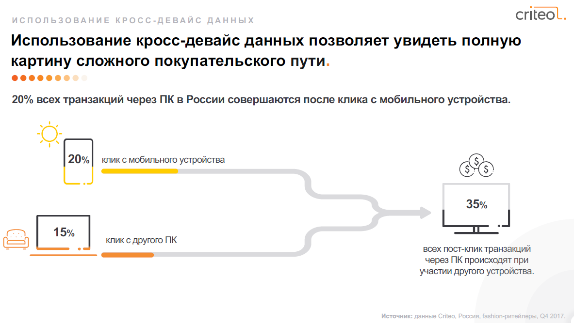 Продажи через десктоп, которые совершаются после клика на смартфоне, достигли 20% в четвертом квартале прошлого года, а с других ПК — 15%.