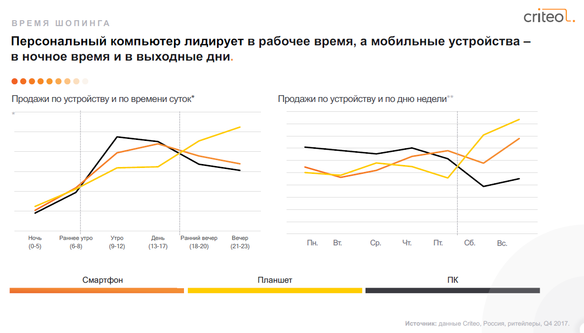 Из расчета по времени суток, пик продаж через десктоп на российском рынке в конце 2017 г. приходился на утро — с 9 до 12 часов. Самыми активными днями были понедельник и четверг. Мобильные покупки пользователи чаще совершали ближе к вечеру в выходные дни.