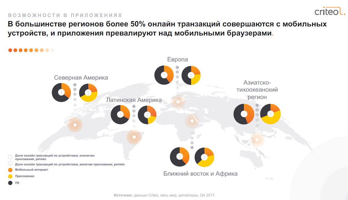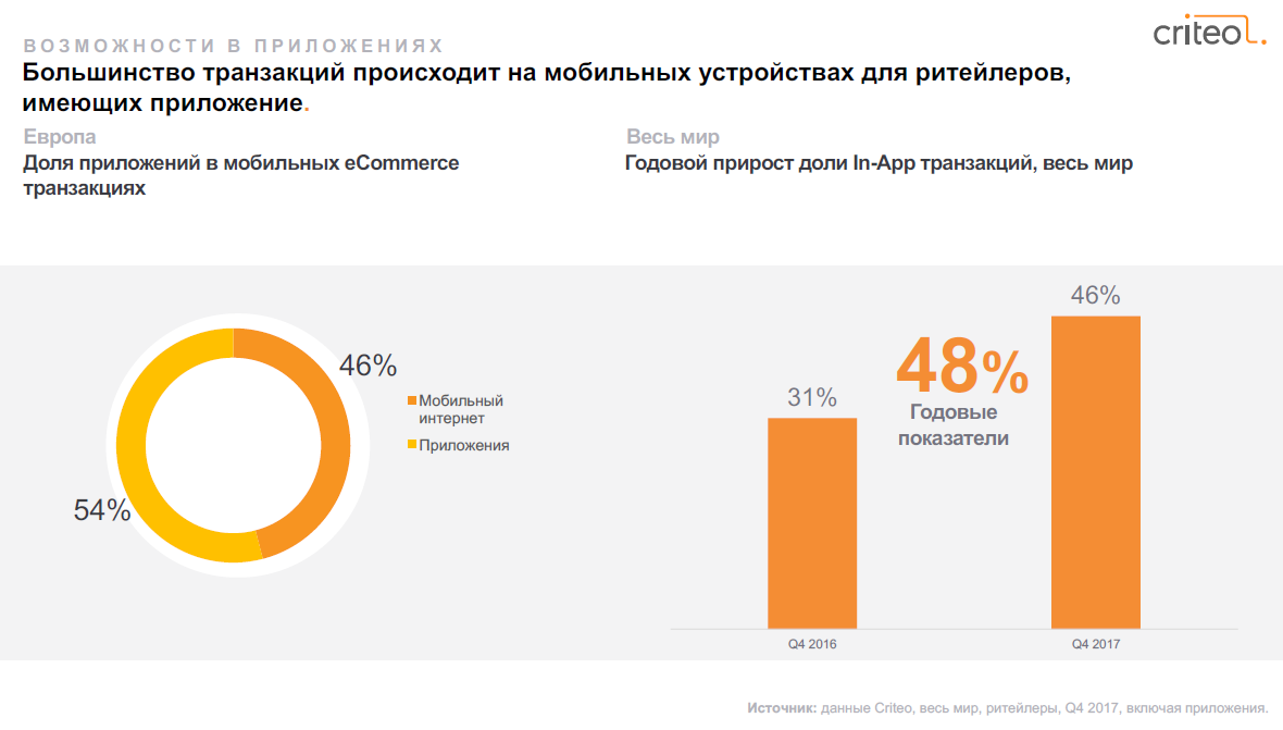 В мобайле количество покупок через браузер в четвертом квартале прошлого года составило 46% и выросло к предыдущему кварталу на 9% за счет падения продаж через приложения. Во всем мире годовой прирост in-App сделок составил 48% за четвертый квартал 2017 г. — рост замедлился к прошлой четверти того же года на 16%.