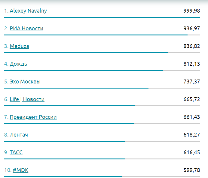 Первое место — у политика Алексея Навального. Его SM Influence составил999,98. На втором месте — аккаунт «РИА Новостей» (936,97). На третьемместе аккаунт издания Meduza — 836,82. В первую десятку также вошли«Дождь» (признан в России иноагентом), «Эхо Москвы», «Life | Новости»,Президент России, «Лентач», ТАСС и #MDK.