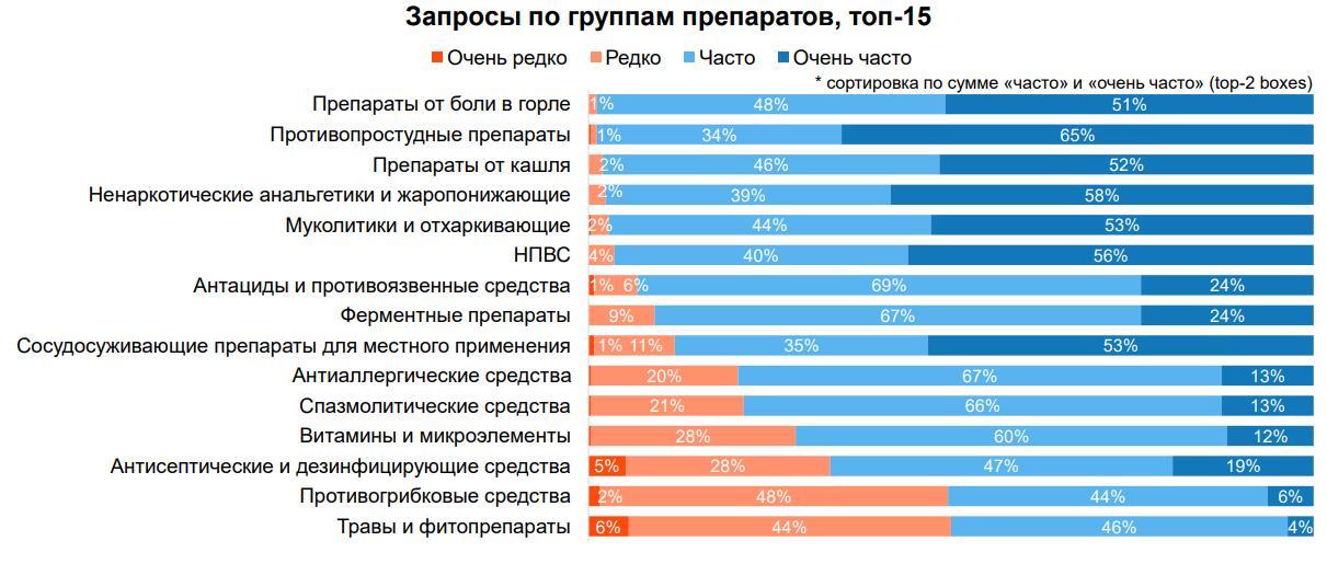 В ходе исследования, проводимого социальной сетью Smartpharma, на вопросы отвечали фармацевты, провизоры и заведующие аптеками. Судя по рейтингу, россияне больше любят лечиться, чем заниматься профилактикой — витамины и фитопрепараты занимают последние места рейтинга. В топе всевозможные препараты от различных симптомов простуды, гриппа и ОРВИ: препараты от боли в горле, противопростудные средства, препараты от кашля, жаропонижающие и отхаркивающие средства