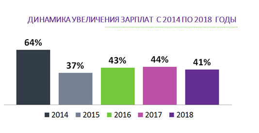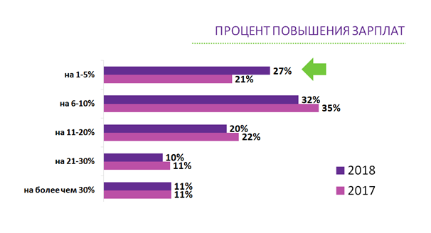 По данным Antal, текущий показатель самый низкий за последние три года: в прошлом году о повышении зарплаты сообщили 44% респондентов, а в 2016 г. значение составляло 43%. При этом все больше компаний индексируют сотрудникам зарплаты всего на 1–5% — в прошлом году такой рост зарплат отметили 21% респондентов, а сегодня практически каждый третий, кто получил повышение, довольствуется прибавкой к зарплате на 1–5%.