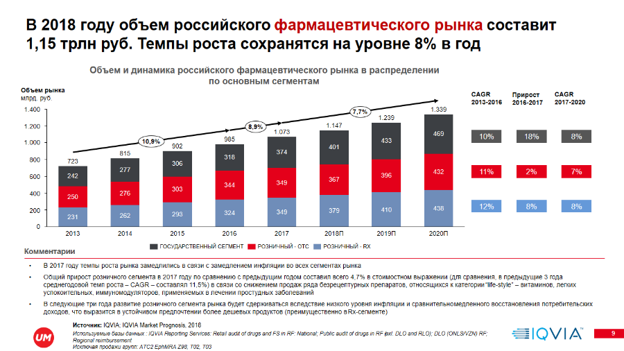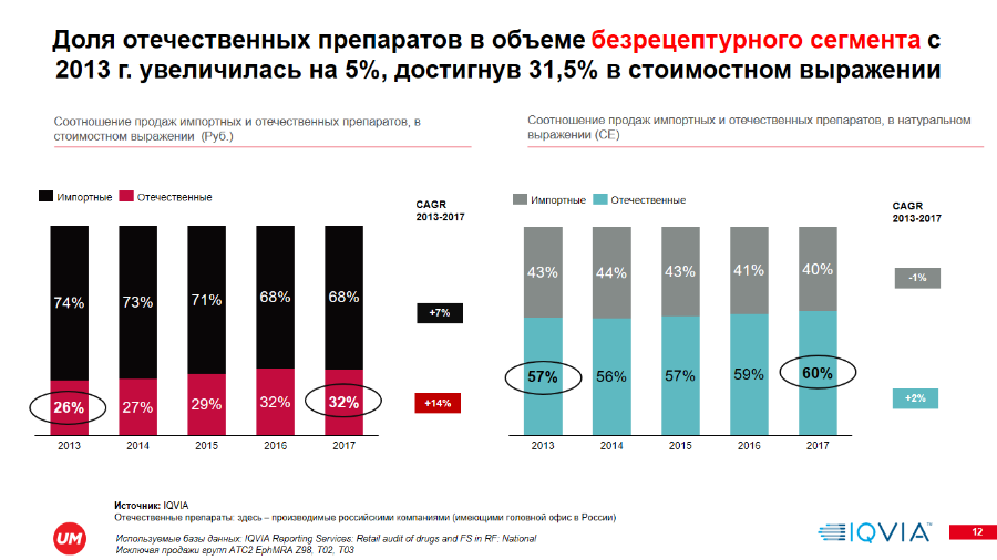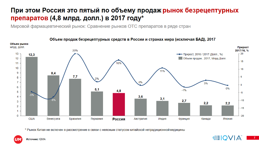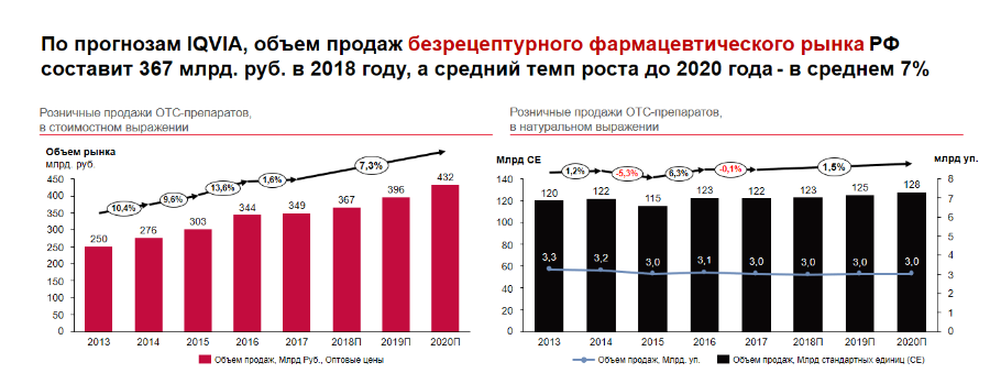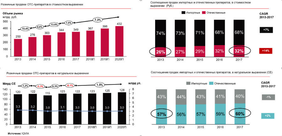 «Сложившаяся кризисная ситуация в российской экономике негативно сказалась на динамике безрецептурного сегмента отечественного фармрынка. Потребители переключились на более дешевые препараты и отказывались от покупки так называемых life-style препаратов. Тем не менее, по нашим прогнозам, ожидается среднегодовой темп роста безрецептурного рынка на уровне 7% до 2020 г., а объем продаж безрецептурного фармацевтического рынка РФ составит 367 млрд руб. в 2018 г. Также надо отметить, что россияне увеличили потребление российских препаратов. Их доля возросла с 26% в 2013 г. до 32% в 2017 г. в стоимостном выражении, а в натуральном выражении достигла 60%», — говорит Алексей Савин, руководитель консалтингового подразделения IQVIA Россия и СНГ.