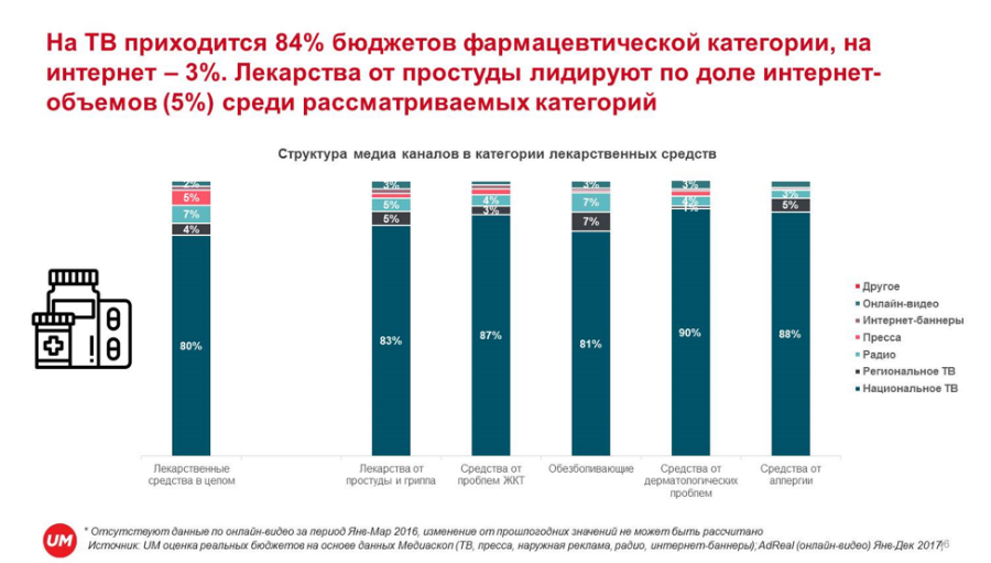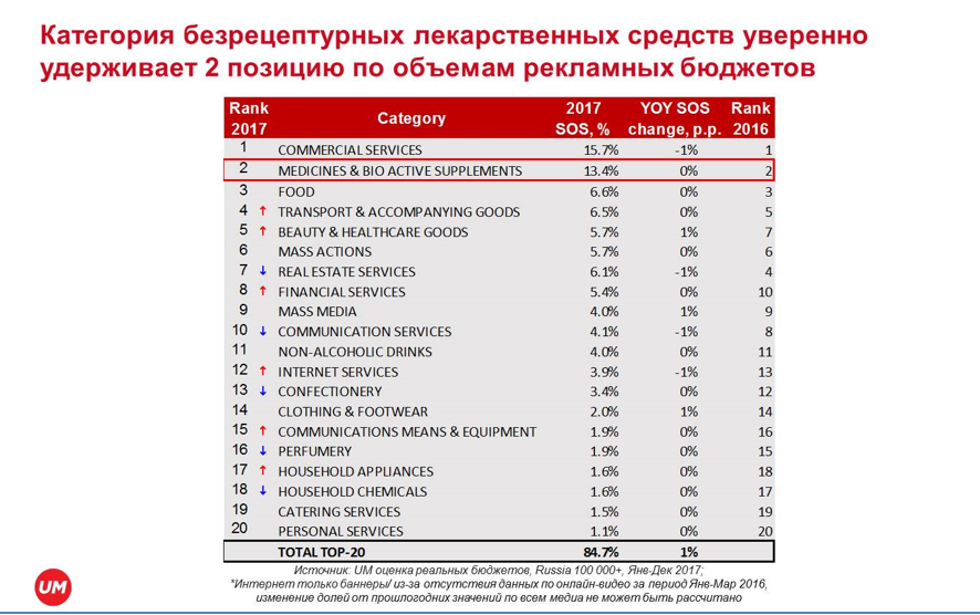 Категория лекарственных препаратов является одной из самых рекламируемых в России и уверенно удерживает вторую позицию по объемам всех рекламных бюджетов и первую — по бюджетам на ТВ-рекламу. На ее долю приходится 13% инвестиций всех рекламных объемов рынка России и 25% ТВ-бюджетов, а рост инвестиций по итогам 2017 г. составил 6%. Лидеры среди рекламируемых препаратов на ТВ — средства от проблем с ЖКТ и от простуды: на них приходится более 40% рекламных бюджетов.